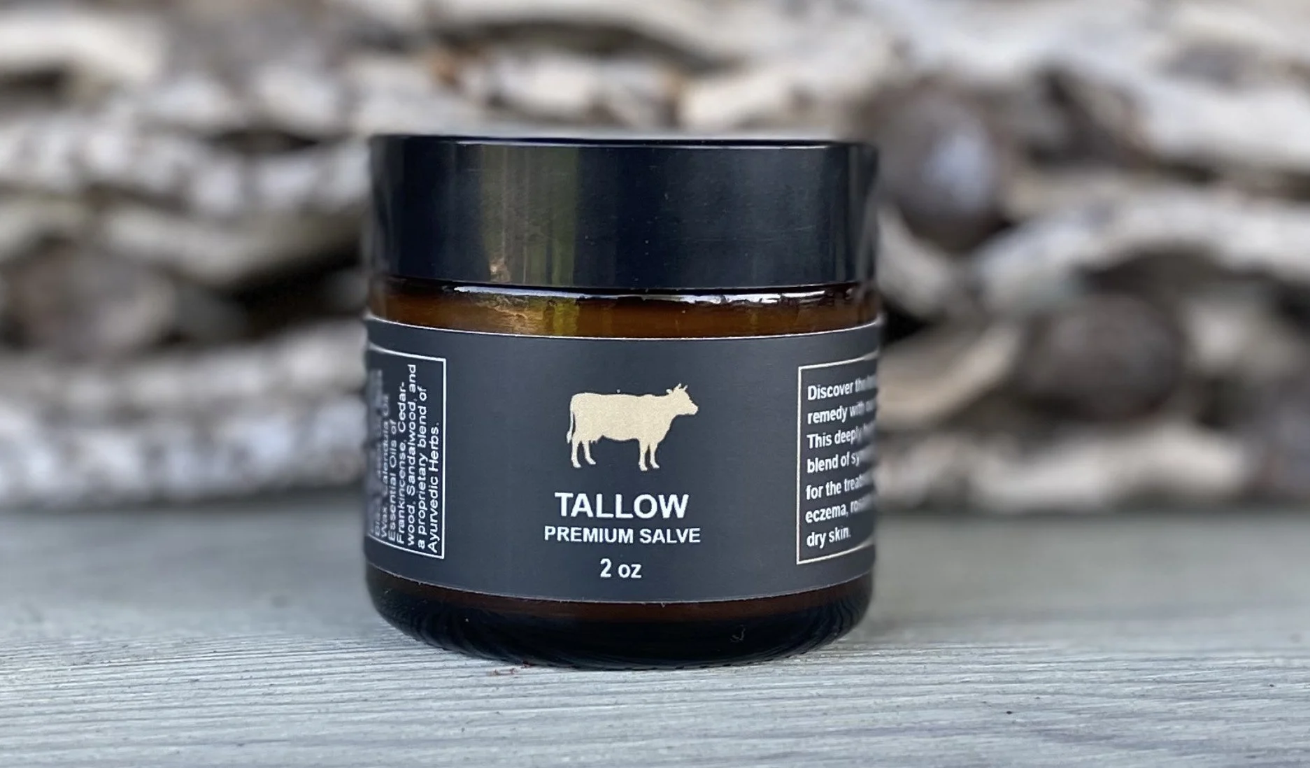 Premium Beef Tallow, Jamaican Black Castor Oil, Bees Wax, Calendula Oil, Essential Oils of Frankincense, Cedarwood, Sandalwood and a proprietary blend of Ayurvedic herbs.